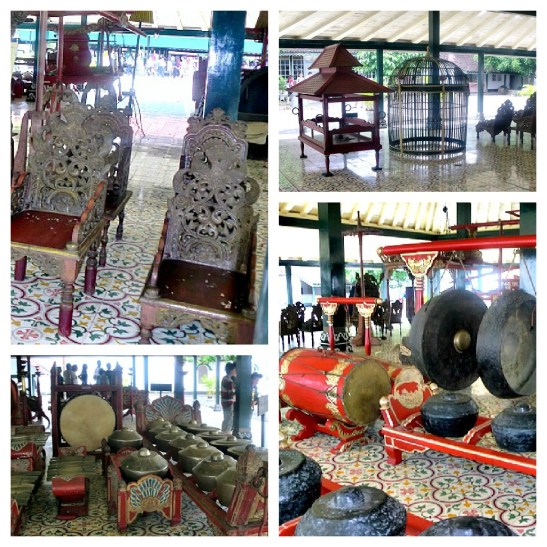 Two large doors welcome you to the Kraton Complex. Upon entering, you would see two buildings full of different things — musical instruments, chairs, a huge bird cage, etc. According to our guide, most of these stuff were used for ceremonies held for the Sultan’s family. There was a gamelan, a musical instrument unique to Indonesia. There was what I thought to be bird cage, but as clarified by our guide, it was where a royal baby was placed to determine which path he would take on in life: money, politics, or knowledge. The chairs were for the the offerings (I thought these were chairs for kids, ha!).