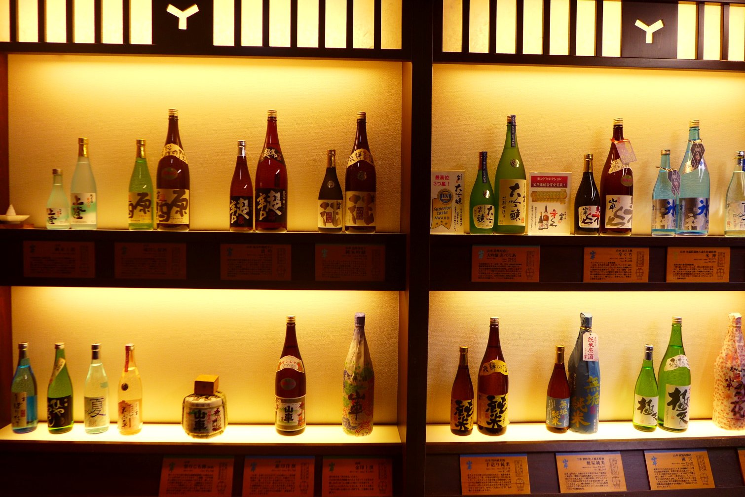 Sake bottles on display